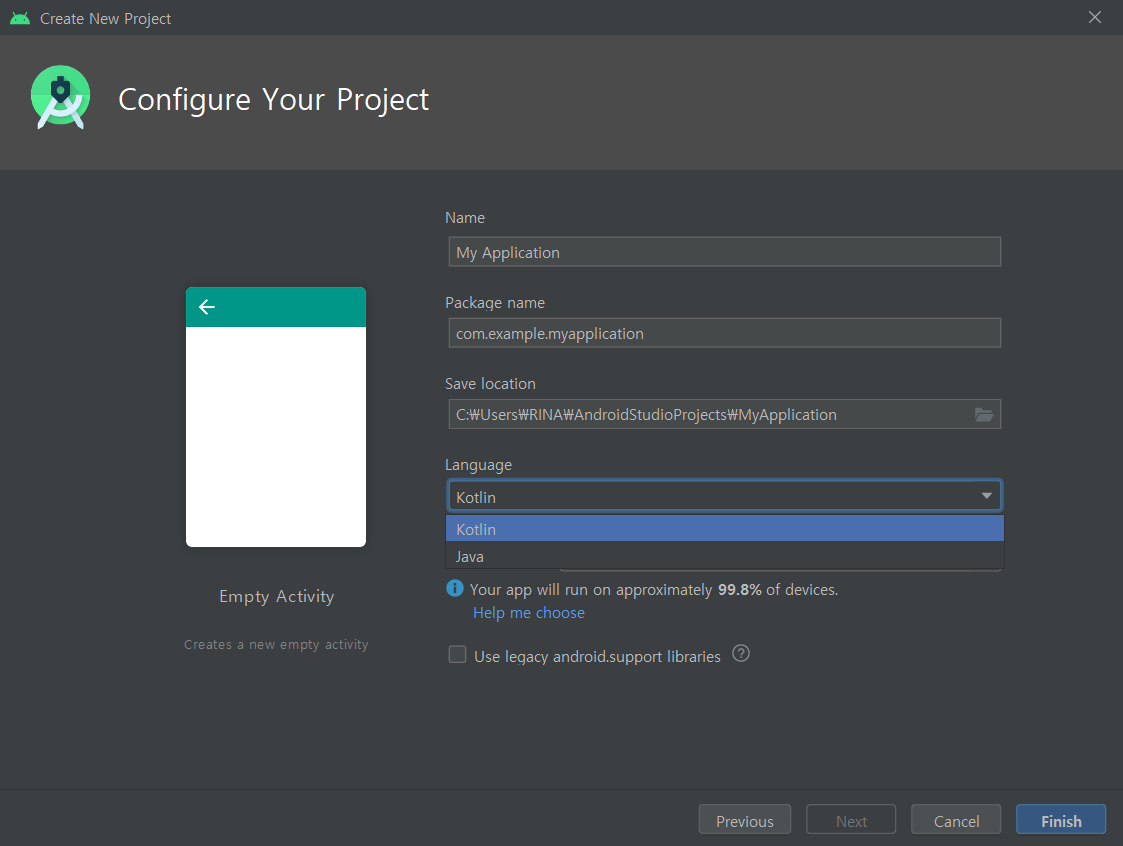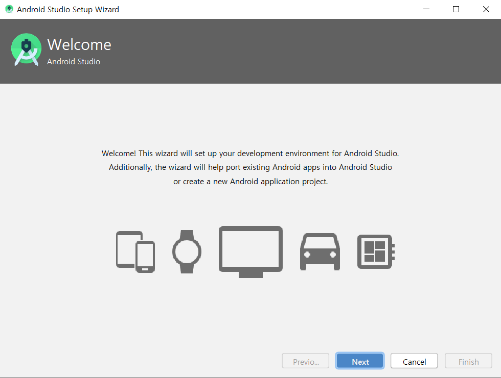 Finish를 누르고 안드로이드 스튜디오를 한 번 실행시켜봅시다.
