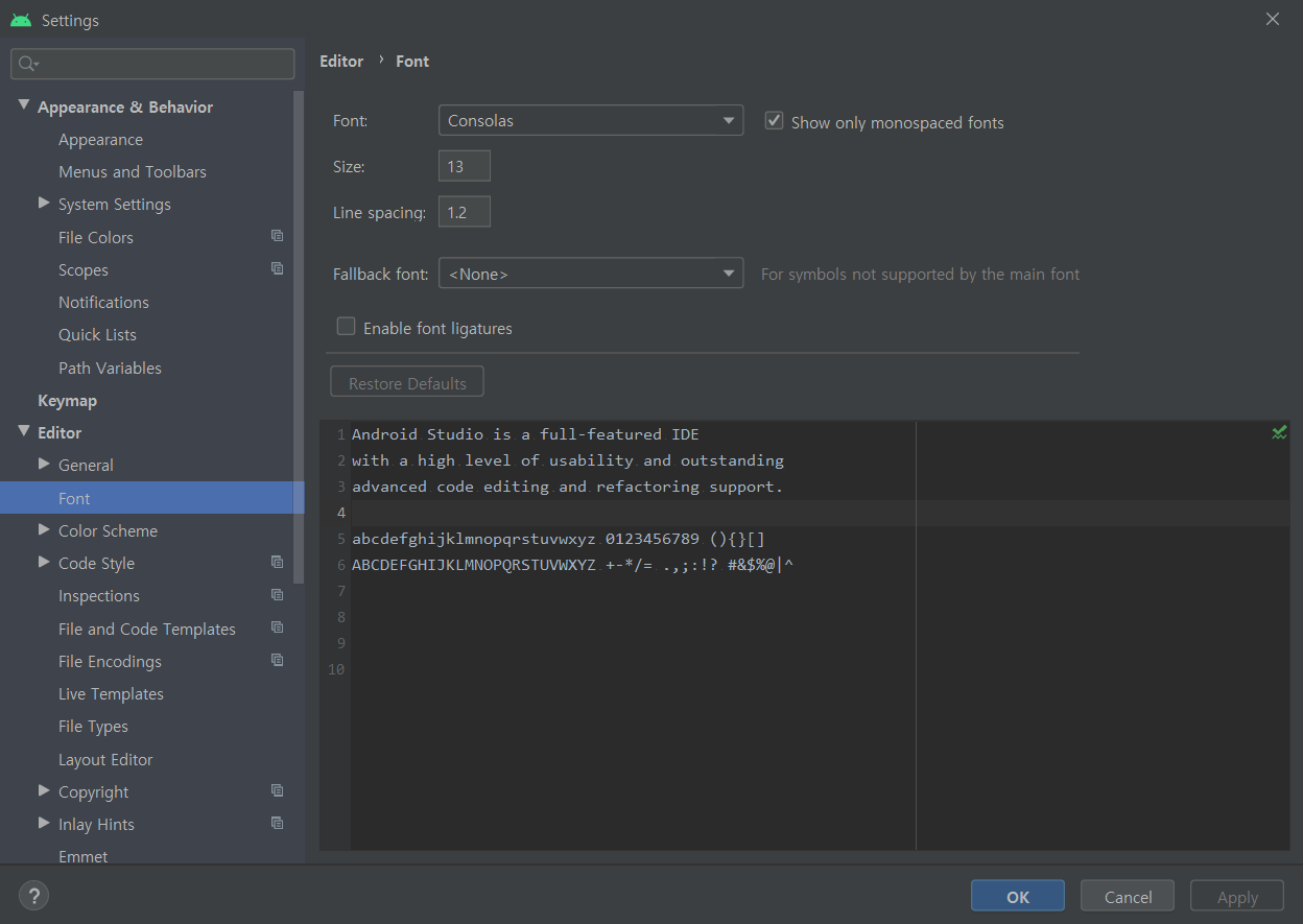 그리고 좌측의 Editor -> Font를 들어가주시면 이렇게 나타납니다.