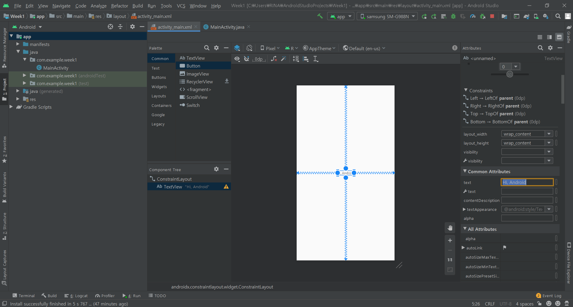 Hello World! 에서 Hi, Android로 바뀐 것을 확인할 수 있습니다!