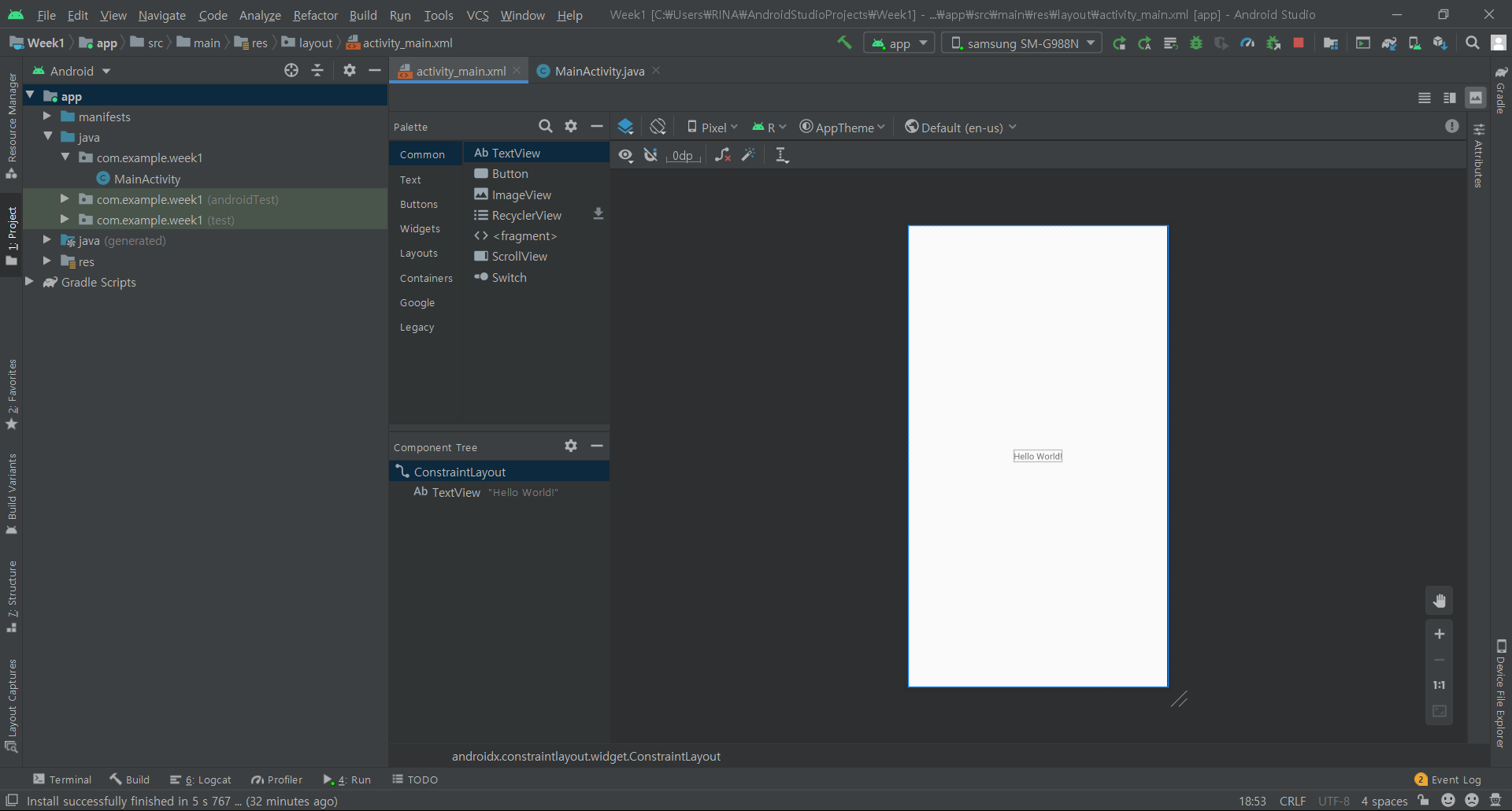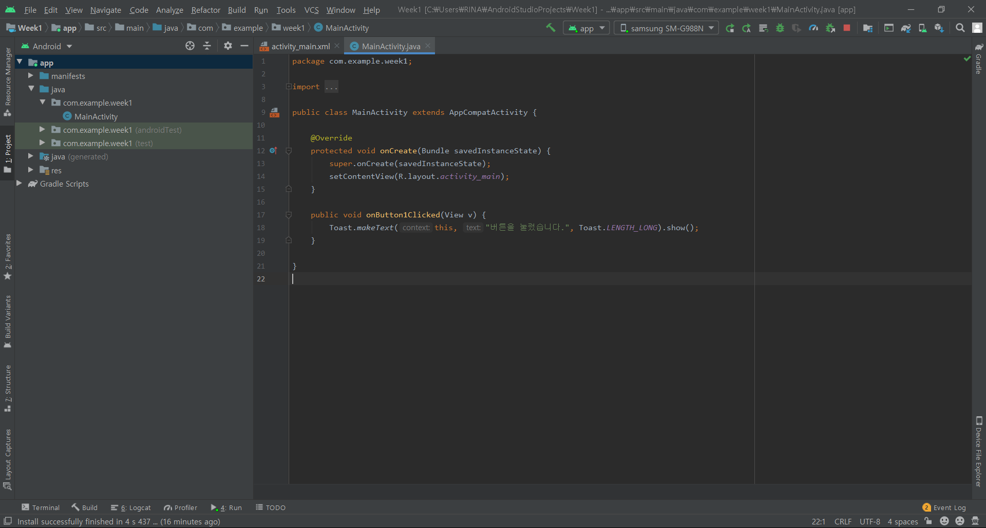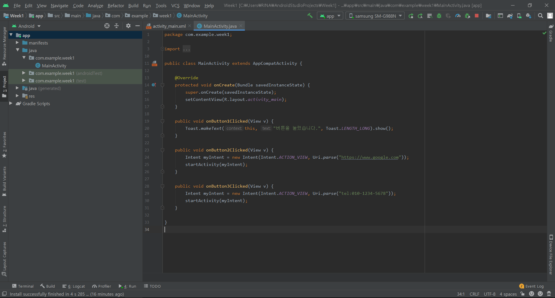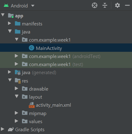 MainActivity.java 파일은 app/java/com.example.week1 내부에 있고