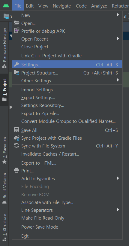 File -> Settings 를 클릭해줍니다.