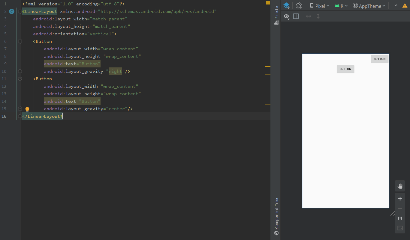 Button의 layout_gravity 속성을 right와 center로 주었더니 위와 같이 정렬된 것을 확인할 수 있습니다.