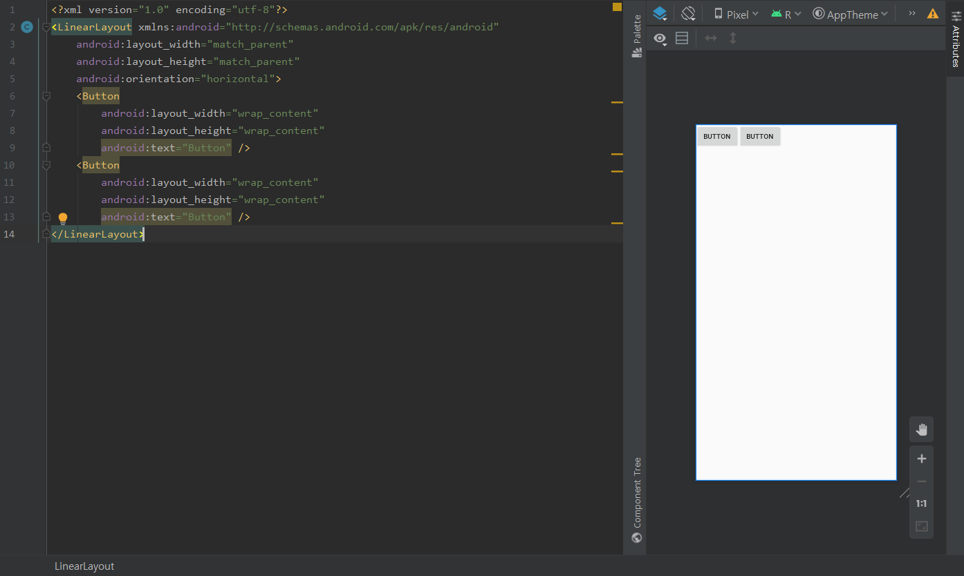 리니어 레이아웃에서 orientation이라는 필수 속성이 있습니다. 레이아웃 내부의 뷰가 배치될 방향을 설정하는 속성입니다.