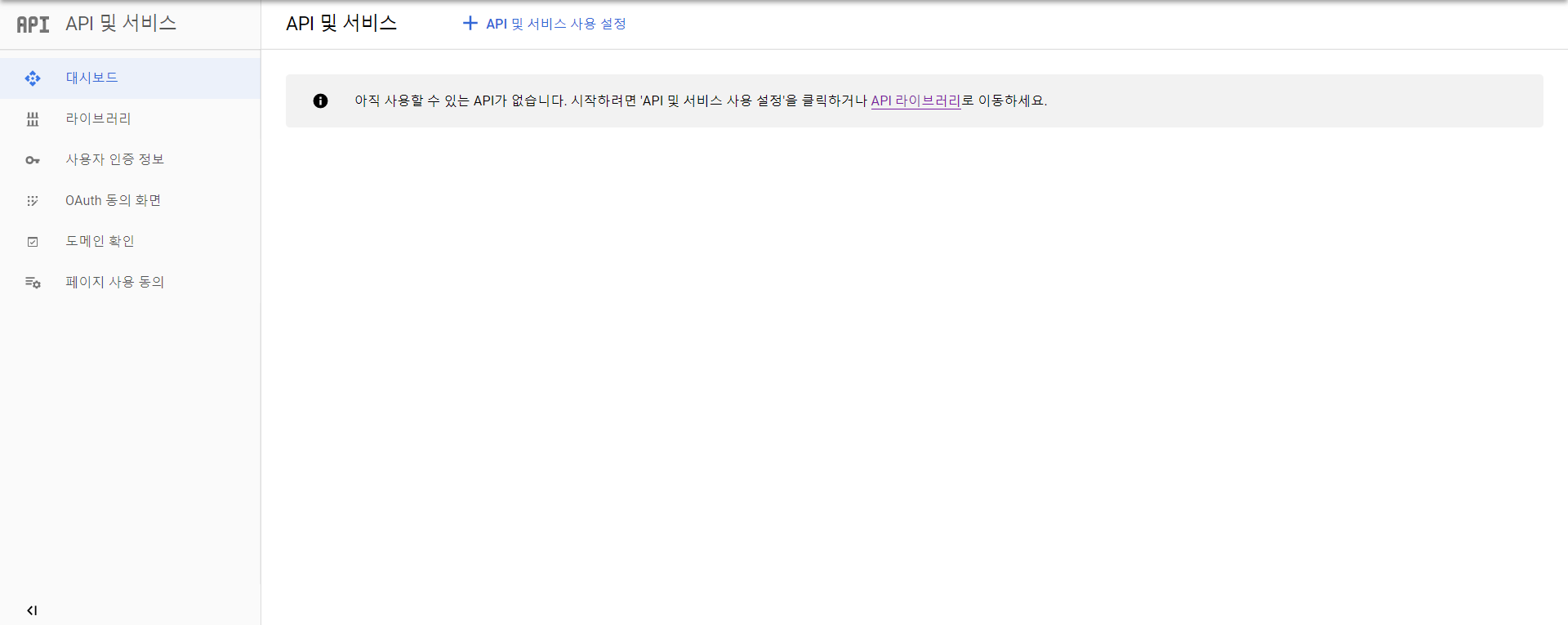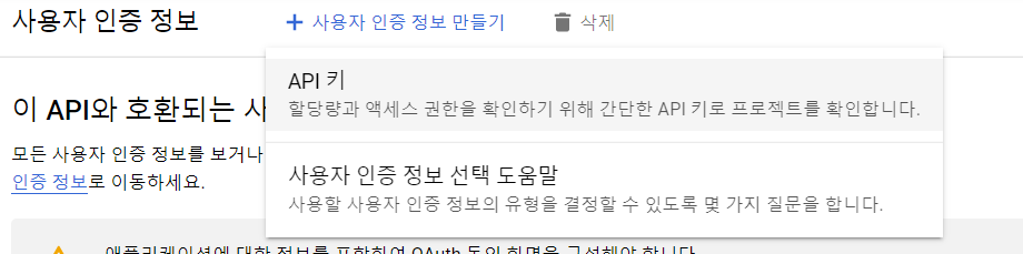사용 설정이 되면 왼쪽의 사용자 인증 정보 메뉴로 들어와줍니다. 그리고 + 사용자 인증 정보 만들기 버튼을 눌러주세요. (저는 이미 한 번 만들어서 화면이 )