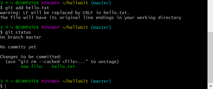 hello.txt라는 Untracked files가 존재한다고 합니다. 깃에서는 한 번도 버전 관리하지 않은 파일을 untracked files라고 부릅니다.