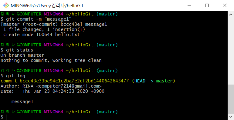 02. 커밋 후 결과 메시지를 보면 파일 1개가 변경되었고, 파일에 1개의 내용이 추가되었다고 나타납니다.