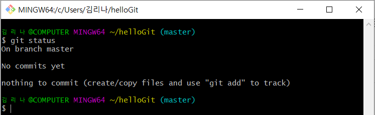 버전으로 만들 파일이 없고(nothing to commit) 작업 트리고 수정사항 없이 깨끗하다(working tree clean)고 나타납니다.
